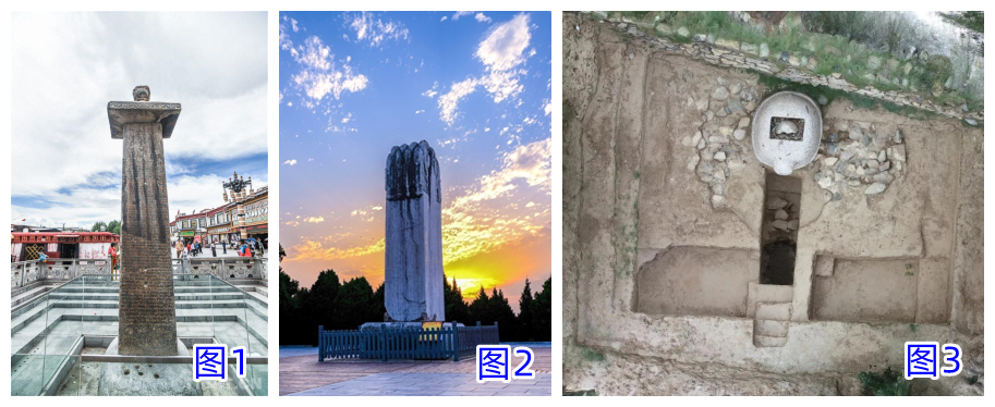 圖1為拉薩大昭寺前的唐蕃會盟碑 圖片來源:中國西藏網(wǎng);圖2為唐乾陵的無字碑 圖片來源:中國乾陵網(wǎng)站;圖3為西藏曲水溫江多遺址龜趺及房址 圖片來源:國家文物局
