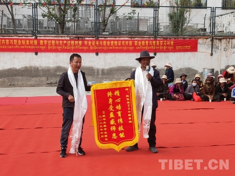 活動(dòng)現(xiàn)場(chǎng),學(xué)生家長代表向?qū)W校贈(zèng)送錦旗并發(fā)表感言。“感謝拉孜縣9+X中職學(xué)校培養(yǎng)了我的孩子,經(jīng)過學(xué)校的精心培養(yǎng),讓家人操碎心的孩子如今依靠從學(xué)校學(xué)到的技藝找到了一份滿意的工作,這讓我一家人感到很欣慰?!睂W(xué)生家長代表白瑪有感而發(fā),“希望在場(chǎng)的孩子們也通過發(fā)揮自己的優(yōu)勢(shì),在社會(huì)上找到一份心儀的工作,同時(shí)真心祝福學(xué)校越辦越好。”
