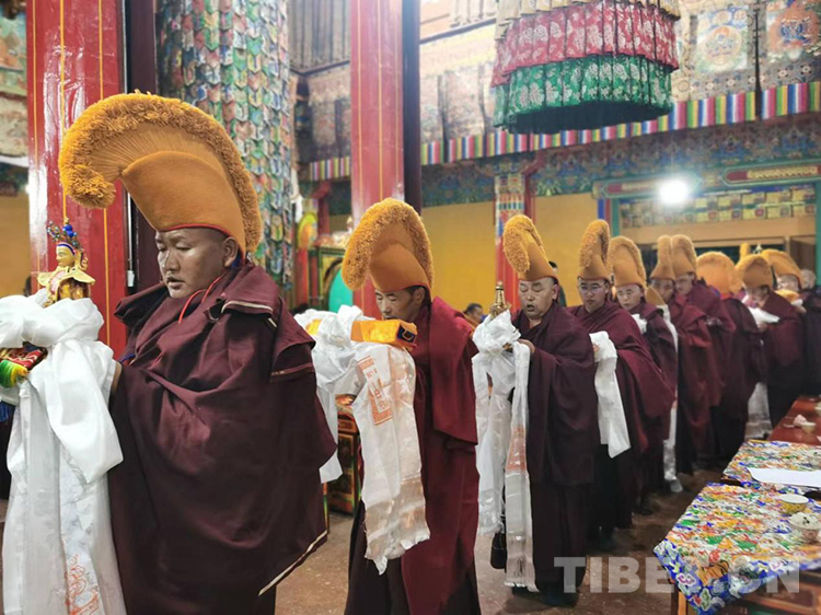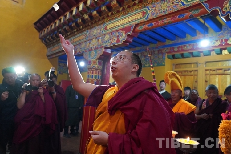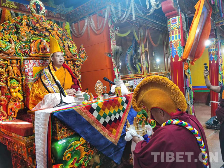 當(dāng)日的拉定寺裝飾一新,班禪一行抵達(dá)后,現(xiàn)場法號齊鳴、法螺合奏,倫珠晉巴和僧眾在寺廟前舉行了隆重的歡迎儀式。隨后,在手持香爐、寶傘高僧的引導(dǎo)護(hù)送下,班禪步入主殿上寶座,向寺廟僧眾傳授《三主要道論》,為僧眾摸頂賜福、發(fā)放布施。