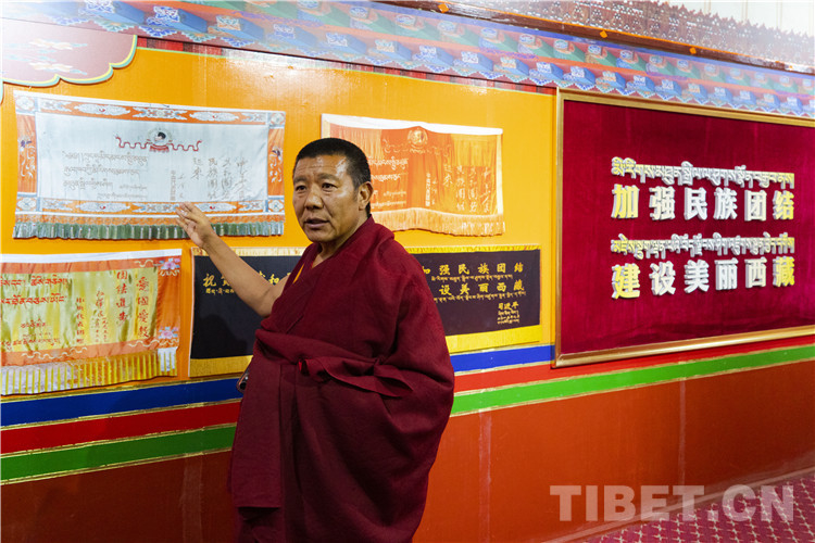 圖為扎什倫布寺管委會(huì)副主任賽巴·多布瓊在該寺民族團(tuán)結(jié)和愛國(guó)主義教育基地講解 攝影:趙振宇
