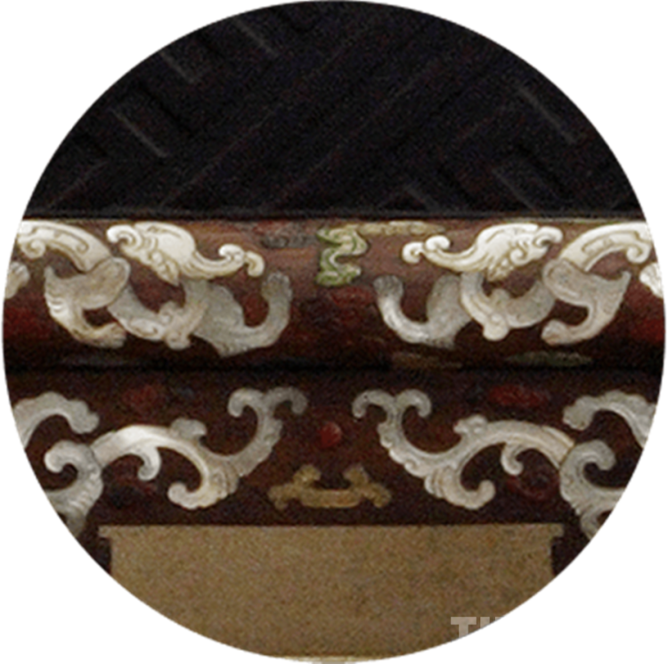 此款黃花梨木百寶嵌龍紋盆架,通體鑲嵌由螺鈿雕刻而成的草龍及拐子龍。前足高74.5厘米,通高201.5厘米,徑71厘米 。盆架六足,由兩層相交的棖子相連。選材優(yōu)良,質(zhì)堅且木色、紋理俱佳。中牌子鑲嵌更見華麗,由牙、角、綠松石、壽山石、瑪瑙、金、銀等組成職貢圖,其中有高山陡崖、蒼松流水及各色人物,遠處彩色祥云中呈現(xiàn)高大的殿堂,猶如人間仙境。(中國西藏網(wǎng) 綜合/周晶)
