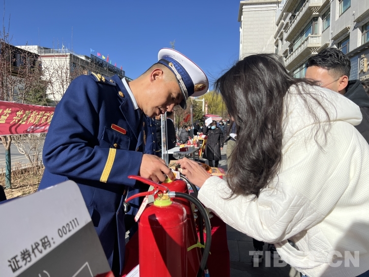 圖為活動(dòng)現(xiàn)場拉薩市消防支隊(duì)工作人員向來往市民講解如何使用滅火器 攝影:德吉卓瑪