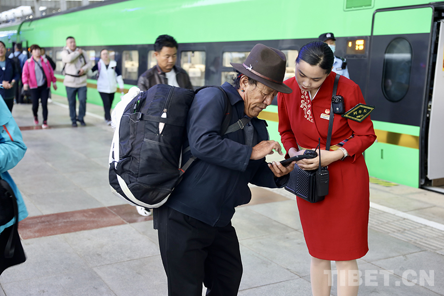 圖為拉日鐵路列車乘務員為旅客提供幫助 攝影:馬生明