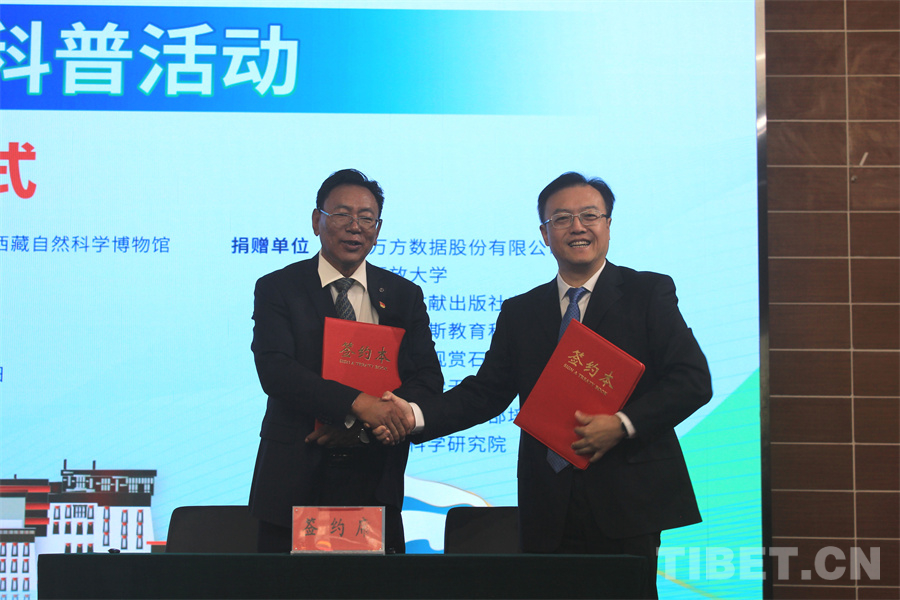 啟動儀式后,來自北京、江蘇、上海及西藏當(dāng)?shù)氐?家企業(yè)和機構(gòu)為計劃提供科普資源捐助。8家資源捐贈方代表與受贈方西藏自然科學(xué)博物館分別簽訂捐贈協(xié)議。