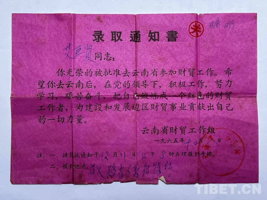 圖為1965年,云南省財貿工作組為訪談對象艾亞賢發(fā)的錄取通知書 供圖:李志農(nóng)