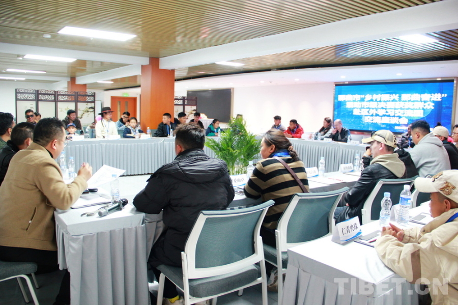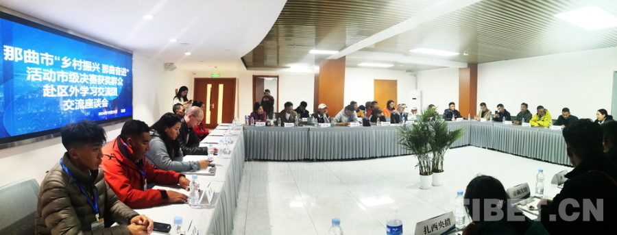 圖為10月22日,來(lái)自西藏自治區(qū)那曲市第三屆“鄉(xiāng)村振興 那曲奮進(jìn)”活動(dòng)市級(jí)決賽第一名獲獎(jiǎng)群眾代表區(qū)外學(xué)習(xí)交流團(tuán)抵達(dá)住地后,與中國(guó)藏學(xué)研究中心專(zhuān)家們進(jìn)行交流座談 攝影:劉莉