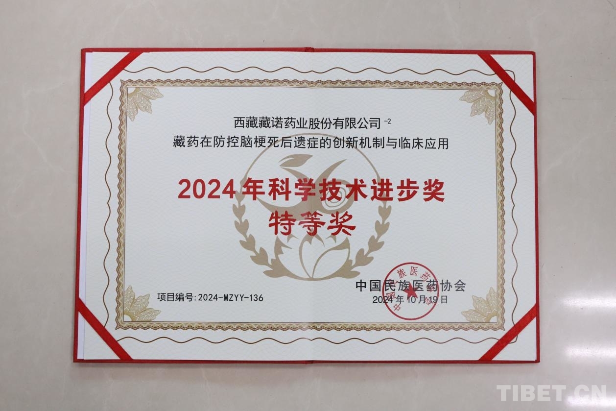 經(jīng)過申報、內(nèi)審和組織有院士、國醫(yī)大師等各民族專家組成的專家委員會初評、終評、公示、報備等環(huán)節(jié)和程序,由河北醫(yī)科大學(xué)第二醫(yī)院、西藏藏諾藥業(yè)股份有限公司、石家莊藏諾藥業(yè)股份有限公司聯(lián)合申報的《藏藥在防控腦梗死后遺癥的創(chuàng)新機制與臨床應(yīng)用》被授予“2024年中國民族醫(yī)藥協(xié)會科學(xué)技術(shù)進(jìn)步獎”特等獎。