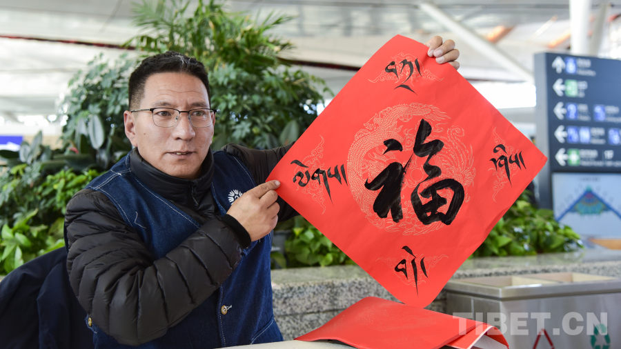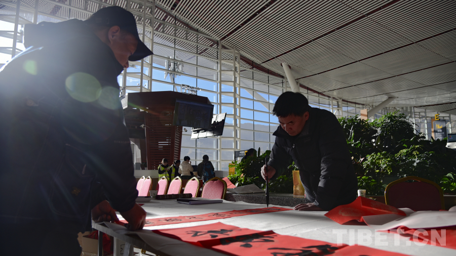 活動(dòng)現(xiàn)場(chǎng),29名西藏文藝志愿者走進(jìn)拉薩貢嘎國(guó)際機(jī)場(chǎng)航站樓,開展送“福”字、送“扎西德勒”、送春聯(lián)、扎木念彈唱等活動(dòng),為過(guò)往旅客和工作人員帶來(lái)了一場(chǎng)別開生面的文化體驗(yàn)。