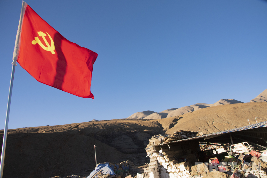 圖為懸掛在古榮村救災(zāi)一線的黨旗 攝影:趙振宇