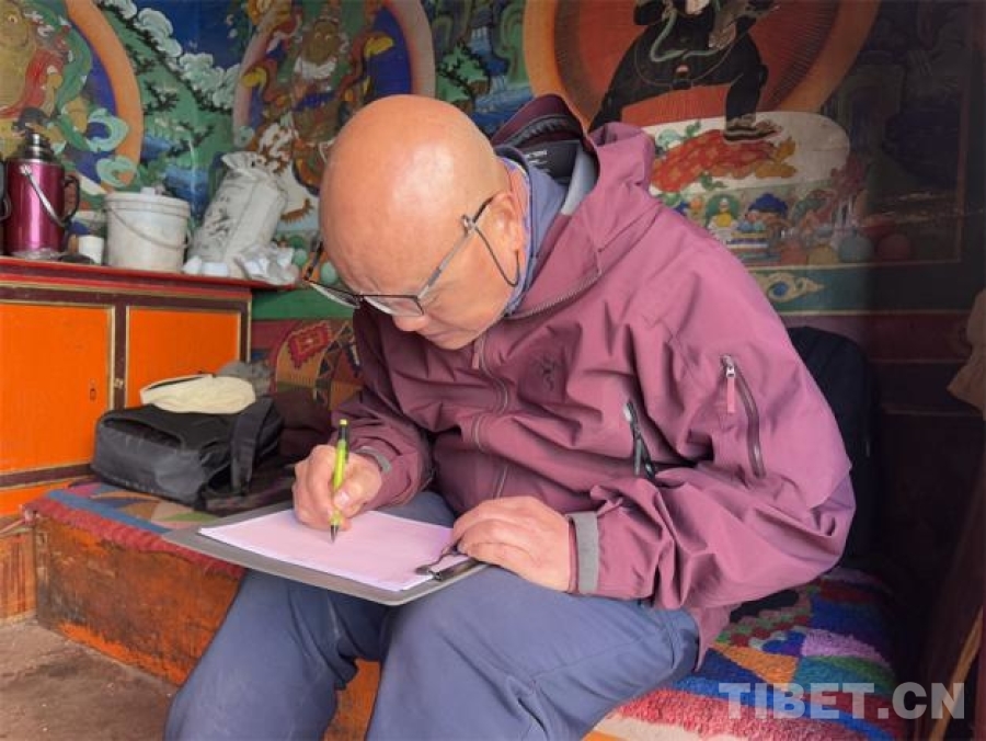 圖為羅文華在薩迦寺內(nèi)認(rèn)真測繪 攝影:王妍丹