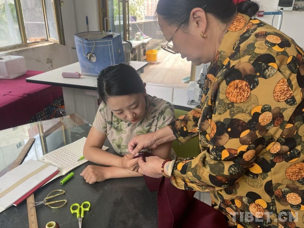 圖為仁青卓瑪(左)和母親在討論細(xì)節(jié)