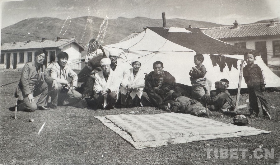 圖為20世紀(jì)80年代,王萬(wàn)青(左五)和群眾在阿萬(wàn)倉(cāng)衛(wèi)生院內(nèi)帳篷前的合影 翻拍:易文文