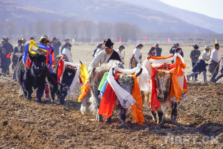 祈福儀式后,極具民族特色的二牛抬杠耕作表演精彩上演。來(lái)自三個(gè)片區(qū)的耕作者身著藏繡華服,用哈達(dá)裝飾耕牛,以傳統(tǒng)木犁翻土開(kāi)壟,在雄渾的勞動(dòng)號(hào)子中,勾勒出千年農(nóng)耕文明的鮮活圖景。