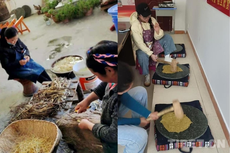 關(guān)于藏紙的起源,學(xué)術(shù)界更偏向《舊唐書·吐蕃》中的記載:唐高宗時(shí)期,吐蕃贊普葉宗弄贊(注:松贊干布)“因請蠶種及造酒、碾、磑、紙、墨之匠”,隨文成公主入藏。自此,西藏關(guān)于紙的技藝因地而成,代代相傳。1300多年后的一個(gè)清晨,在金東鄉(xiāng)的工坊內(nèi),記者見到了金東藏紙制造技藝非遺傳承人加里,也看到了藏紙一大分支——金東藏紙中的古法脈搏。