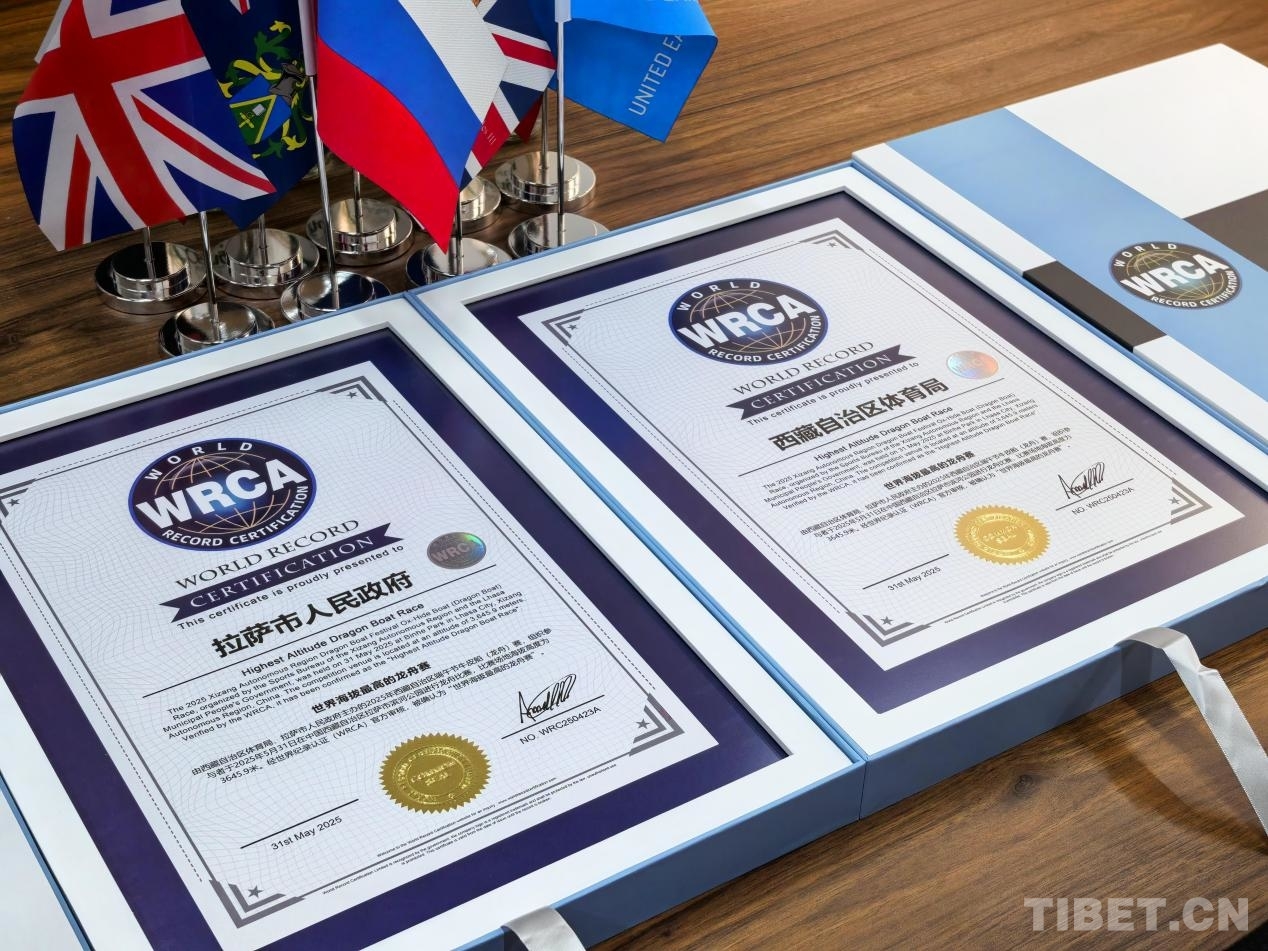 世界紀(jì)錄認(rèn)證機(jī)構(gòu)(WRCA)認(rèn)證官馬克先生發(fā)來賀電;WRCA中國區(qū)認(rèn)證官王靜女士現(xiàn)場宣布了世界紀(jì)錄認(rèn)證結(jié)果;WRCA中國區(qū)負(fù)責(zé)人、世界紀(jì)錄申報(bào)中心主任趙青太為西藏自治區(qū)體育局、拉薩市人民政府頒發(fā)了“世界海拔最高的龍舟賽”世界紀(jì)錄認(rèn)證書。