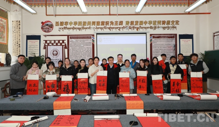 走進(jìn)西藏民族大學(xué)社科樓里內(nèi)的“鑄牢中華民族共同體意識(shí)書法實(shí)踐基地”,基地負(fù)責(zé)人扎西曲杰正帶領(lǐng)他的小伙伴書寫書法作品。指著一幅幅書法作品,扎西曲杰自豪地說,我們基地的各族學(xué)生用“寫”在一起的形式傳承中華優(yōu)秀傳統(tǒng)文化,推廣國家通用語言文字,助力中華民族共同體建設(shè)。