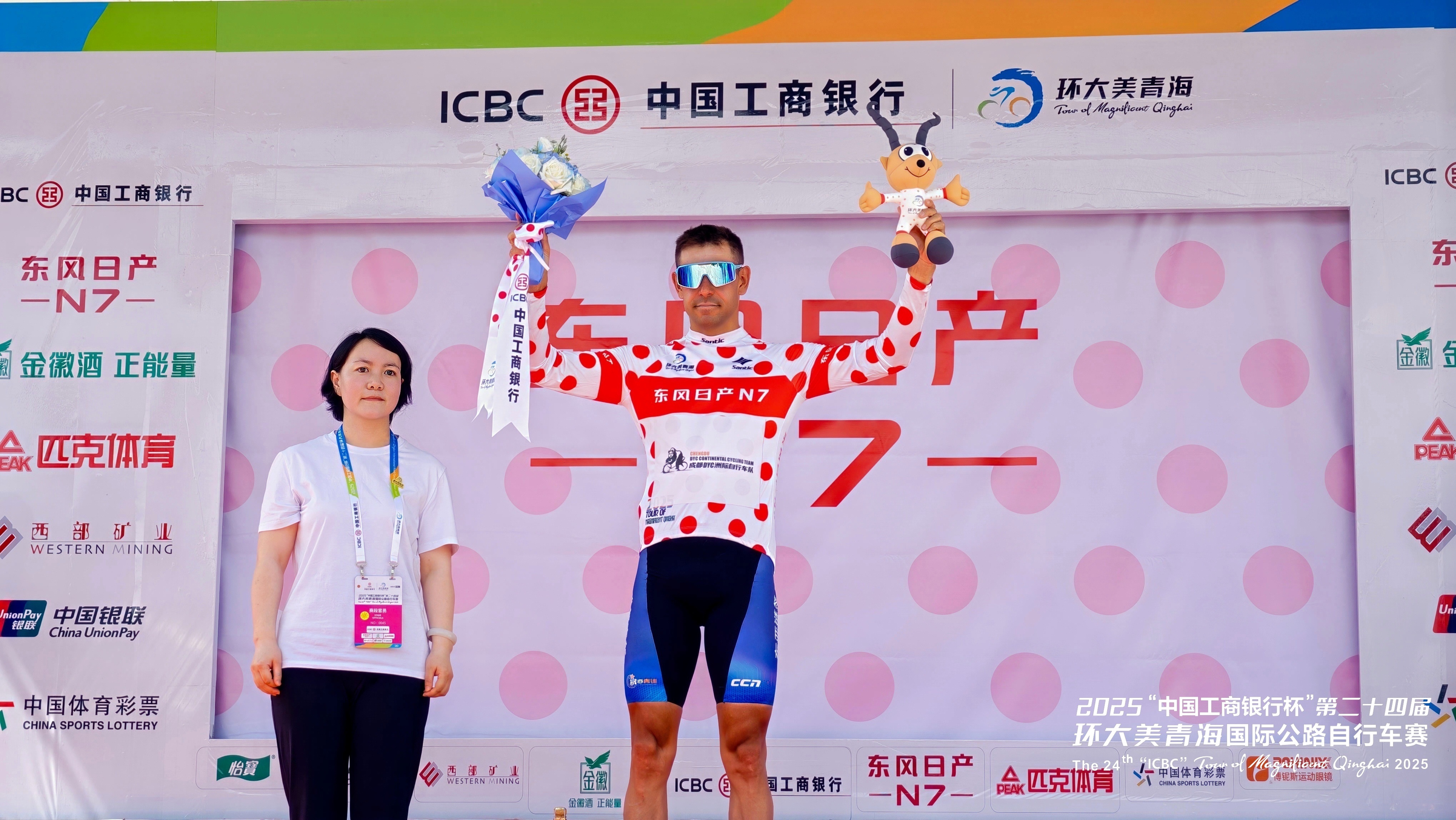 圖為本屆環(huán)青賽第一賽段結(jié)束后“圓點(diǎn)衫”獲得者,也被人們形象地稱(chēng)為“爬坡王”。