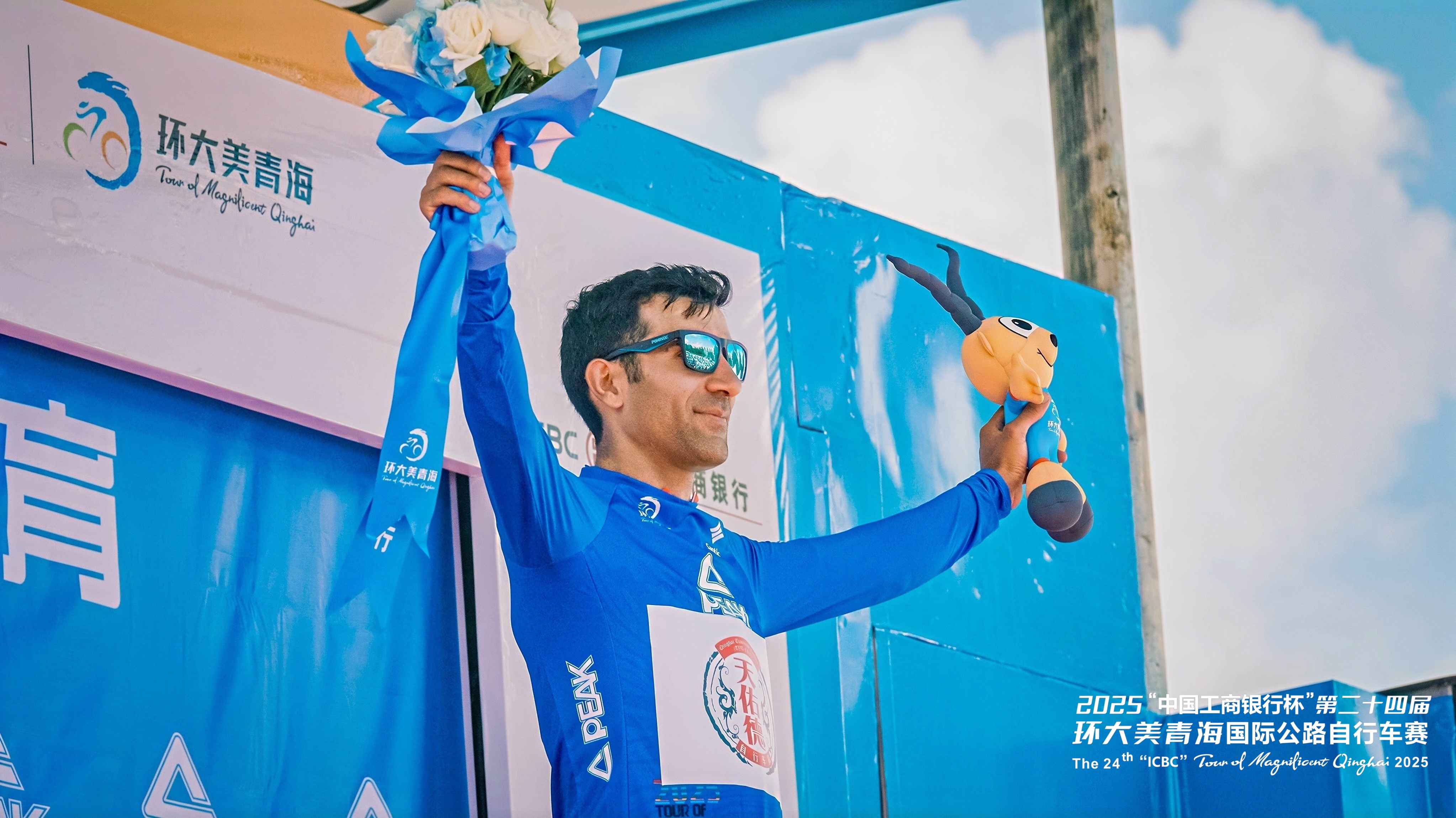 圖為本屆環(huán)青賽第一賽段結(jié)束后“藍(lán)衫”獲得者,相當(dāng)于“亞洲車(chē)手中的黃衫”。