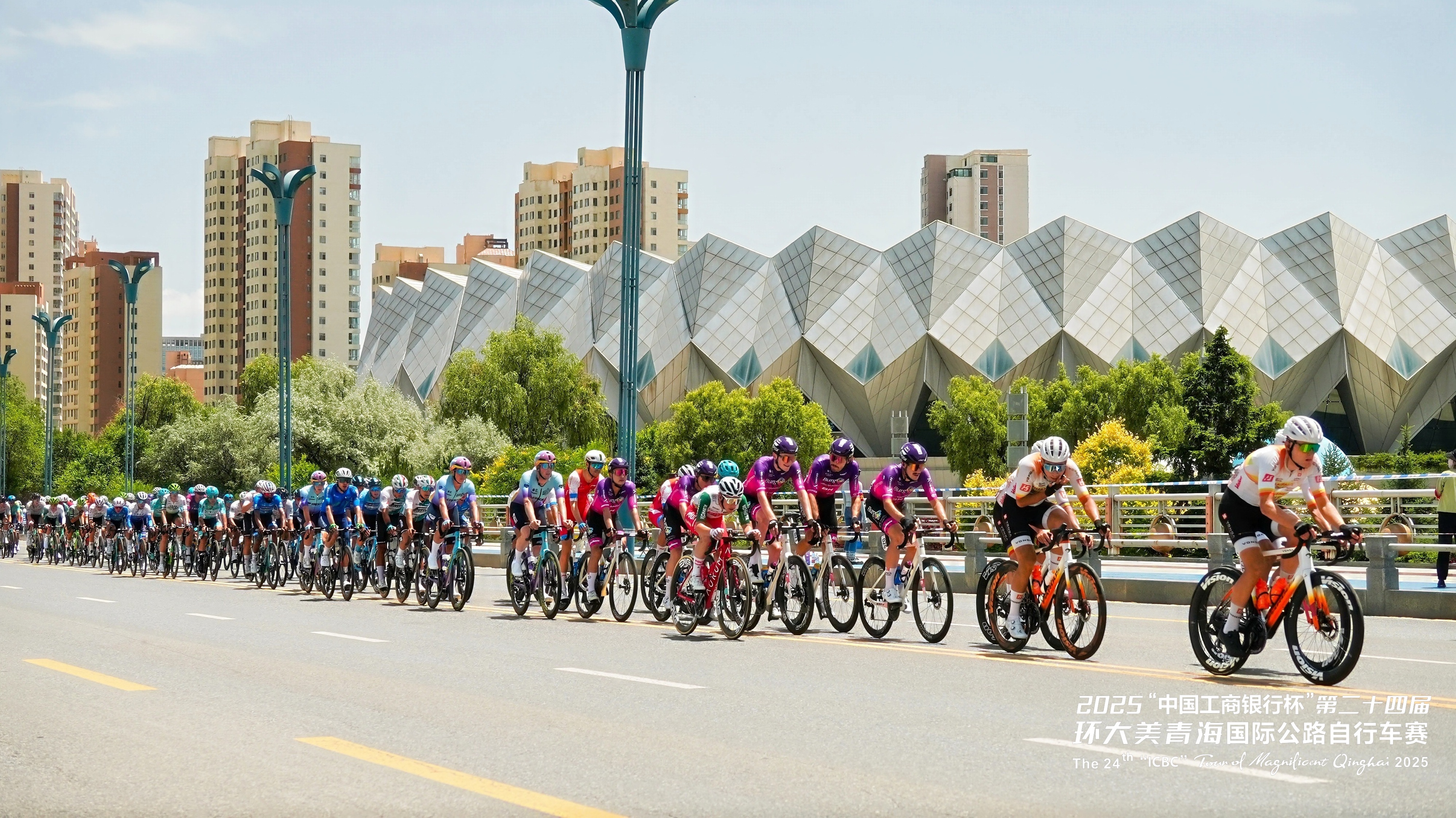 第二十四屆環(huán)青賽的第一賽段——西寧繞圈賽,選手們穿行于西寧市繁華的鋼鐵森林中,感受這座高原古城的現(xiàn)代活力。圖為選手們騎行至青海體育中心。