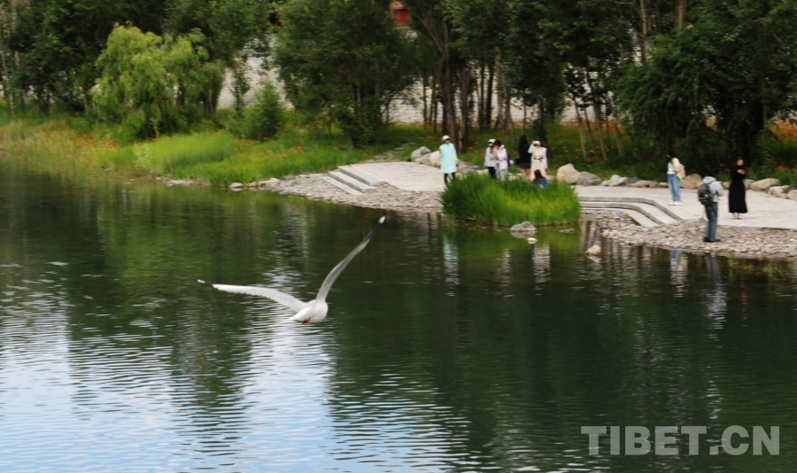 圖為拉薩兩島內(nèi)河綠色生態(tài)廊道一隅,水鳥(niǎo)在天空中飛過(guò) 攝影:劉莉