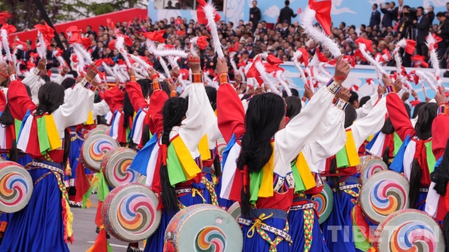 圖為慶祝大會(huì)現(xiàn)場充滿吉祥喜慶氣氛的盛大群眾游行 攝影:德吉卓瑪