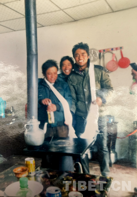 這是九十年代在阿里拍的,拍攝地點(diǎn)是現(xiàn)在的康樂新區(qū)。從照片上可以看到,那時候阿里建設(shè)得挺好。右邊第一個穿燈籠褲的是我。這種褲子當(dāng)時特別流行,年輕小伙子們穿上可高興了。穿藏袍的是我弟弟,那時他還是個普通牧民,后來通過自己的努力,已經(jīng)是我們的村長了。戴墨鏡的是我們同村的,開車時和人發(fā)生沖突打壞了眼睛,去內(nèi)地治療花了十多萬。后來因?yàn)檠劬栴}駕照被注銷,也就沒辦法繼續(xù)開車了,現(xiàn)在在拉薩當(dāng)保安。當(dāng)時他正好在阿里開出租車,我們找到他一起拍了這張照片。左邊的大個子現(xiàn)在開了個商店和茶館,生意不錯。