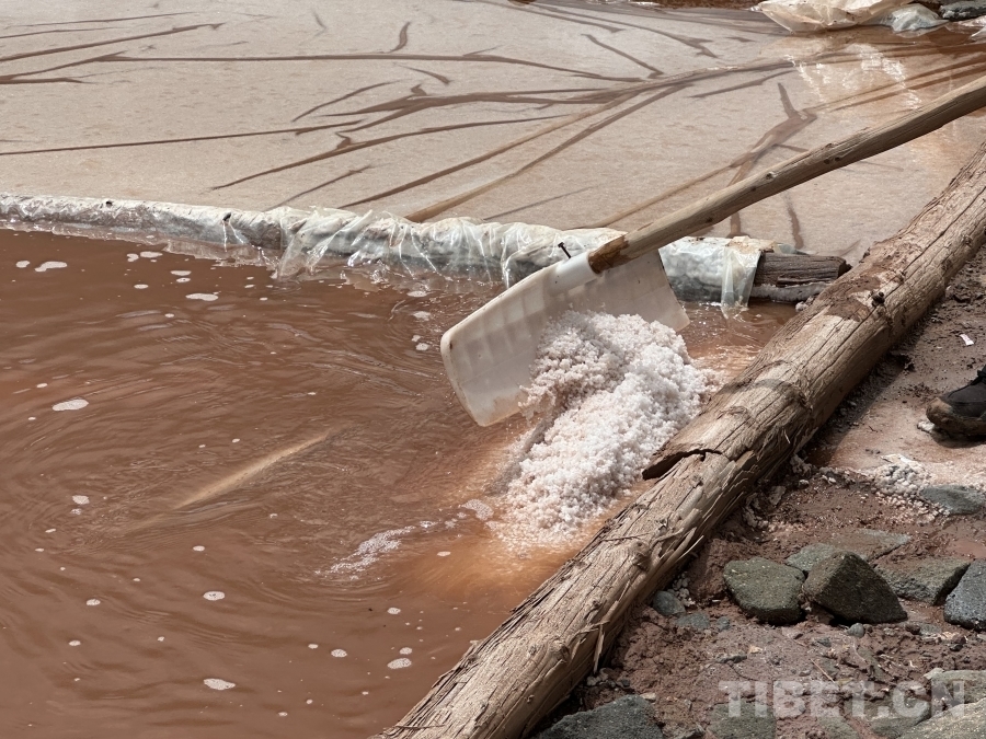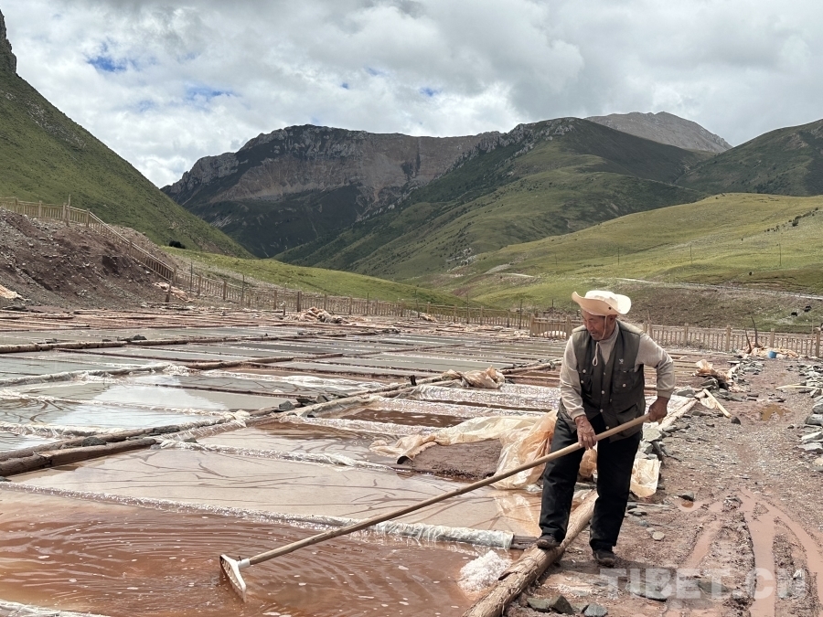 鹽田里,78歲的江羊巴桑正彎腰勞作,傳承著千年不變的制鹽技藝。江羊巴桑是白扎鹽場的一名鹽工,鹽是他們一家人賴以生存的東西,父輩靠鹽養(yǎng)活了他,他也靠著鹽養(yǎng)大了自己的十一個孩子。這位老鹽工曾在綜藝節(jié)目《種地吧》向觀眾展示了當(dāng)?shù)厝斯欧ㄖ汽}的智慧。他在節(jié)目中表示:“為了養(yǎng)活一家老小,從小就開始制鹽,一直干到現(xiàn)在。以后無論是我的兒子,還是這個地區(qū)的年輕人,希望未來可以學(xué)習(xí)并延續(xù)好這一制鹽技藝?!苯虬蜕:唵味鎿吹脑竿?,就是希望這種傳統(tǒng)的手工制鹽能夠代代相傳。