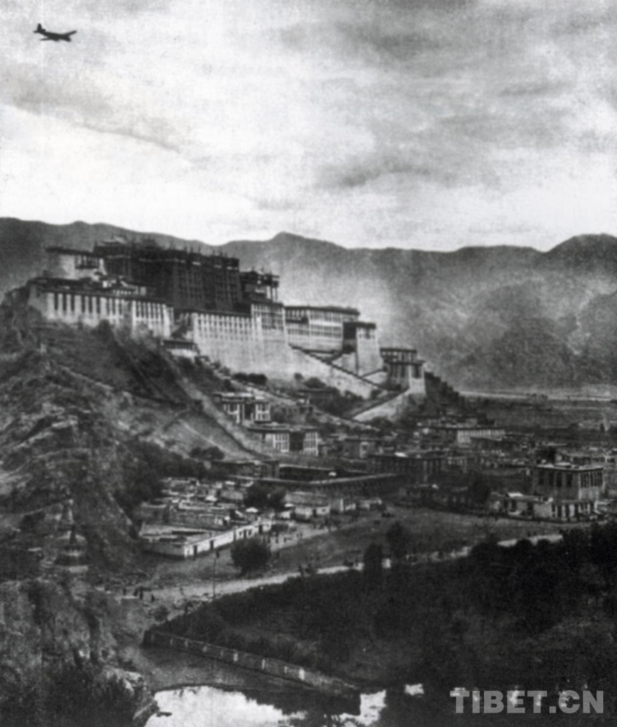 歷史照片:西藏民航飛機(jī)飛過布達(dá)拉宮。民航西藏自治區(qū)管理局供圖