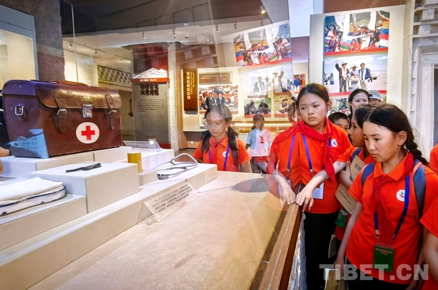 圖為西藏阿里噶爾縣孔繁森小學師生在孔繁森同志紀念館仔細閱讀國家一級文物、孔繁森小藥箱的介紹 攝影:劉莉
