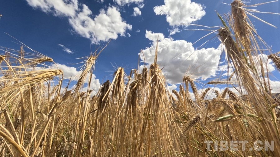 圖為藍(lán)天白云之下飽滿的青稞迎來(lái)成熟 攝影:德吉卓瑪