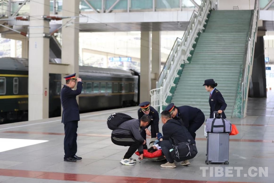 圖為拉薩火車站客運值班員對特殊旅客提供特殊轉(zhuǎn)運幫助