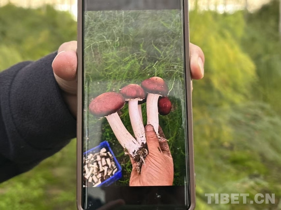 圖為李東平展示手機(jī)里的赤松茸照片 攝影:楊眉笑