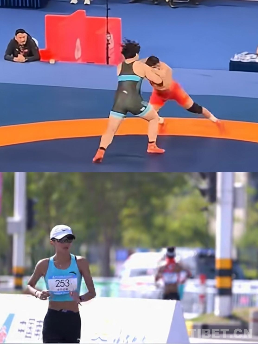 視頻截圖為西藏摔跤運(yùn)動(dòng)員洛松西繞(上)和競(jìng)走運(yùn)動(dòng)員卓瑪拉姆(下)在比賽中