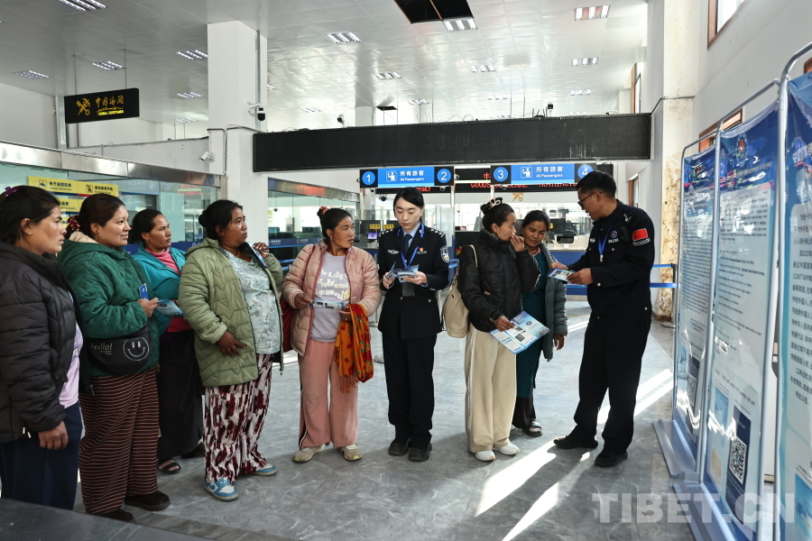 圖為聶拉木邊檢站民警為旅客講解新政策 攝影:鄒興國(guó)