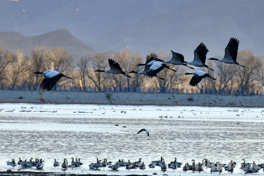 黑頸鶴是世界上最晚被發(fā)現(xiàn)的一種鶴類,是全球15種鶴類中唯一一種繁殖和越冬都在高原地區(qū)的鶴類,也是中國特有的珍稀鶴類,屬國家一級保護野生動物,在《中國生物多樣性紅色名錄—脊椎動物卷》(2020)中被列為易危(VU)物種。它們主要棲息于海拔2500米至5000米之間的高原濕地,曾因環(huán)境惡劣、食物匱乏導致種群數(shù)量岌岌可危,因此被譽為“鳥類大熊貓”,它們飛越崇山峻嶺,甚至飛過世界之巔——珠穆朗瑪峰,飛行高度可達萬米。據(jù)學者觀察,黑頸鶴主要分布于中國甘肅、新疆、西藏、青海、云南、四川西部、貴州和內蒙古。每年冬季,大批黑頸鶴從繁殖地遷徙到雅魯藏布江中游河谷地帶越冬,而拉薩市林周縣是黑頸鶴在此重要的越冬地之一,黑頸鶴數(shù)量可達到2000余只。