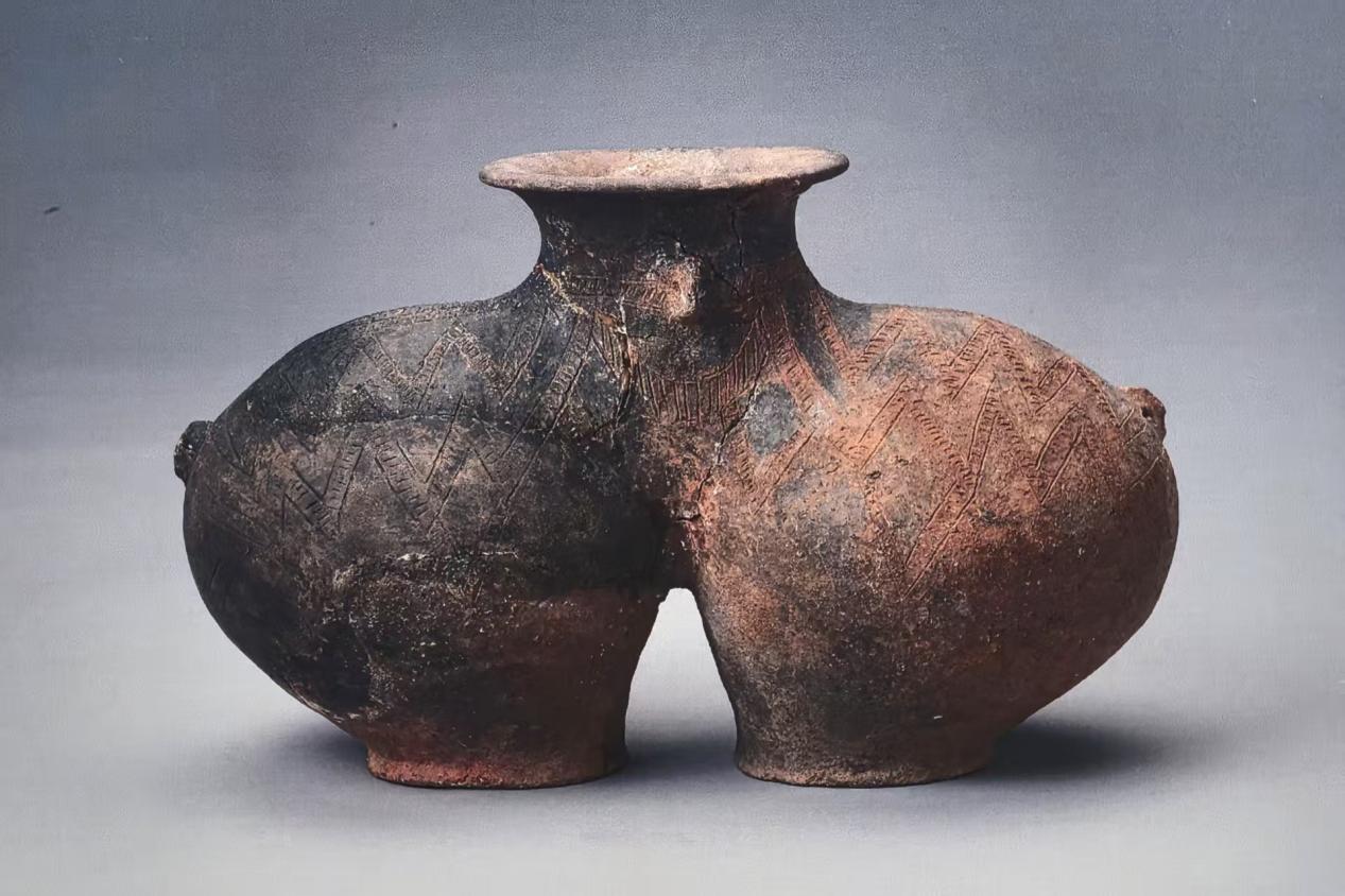 圖為卡若遺址朱墨彩繪雙體陶罐(翻拍自民族文化宮展覽) 攝影:邊子捷