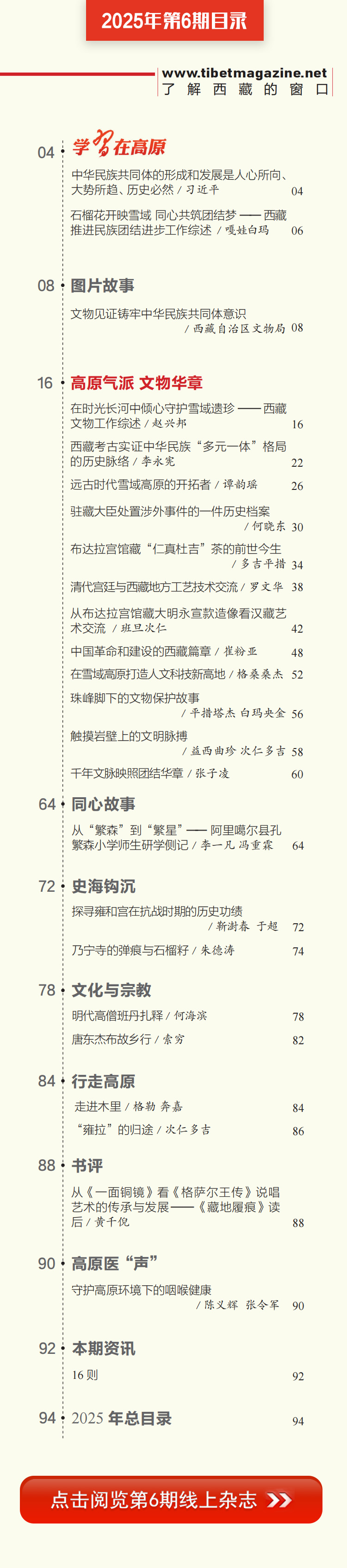歲聿云暮,秋收冬藏?!吨袊?guó)西藏》漢文版2025年第6期如期與讀者見(jiàn)面了,本期雜志是西藏文物專刊,得到了西藏自治區(qū)文物局、故宮博物院的大力支持,集納了有關(guān)文稿13篇、圖片90余幅,從文物考古角度追溯各民族交往交流交融的歷史,展現(xiàn)青藏高原文明崛起與民族融合的壯麗詩(shī)篇。