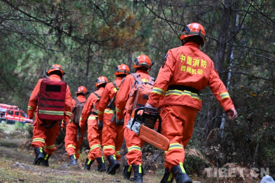 圖為消防指戰(zhàn)員攜裝巡護(hù) 攝影:仁青旺堆