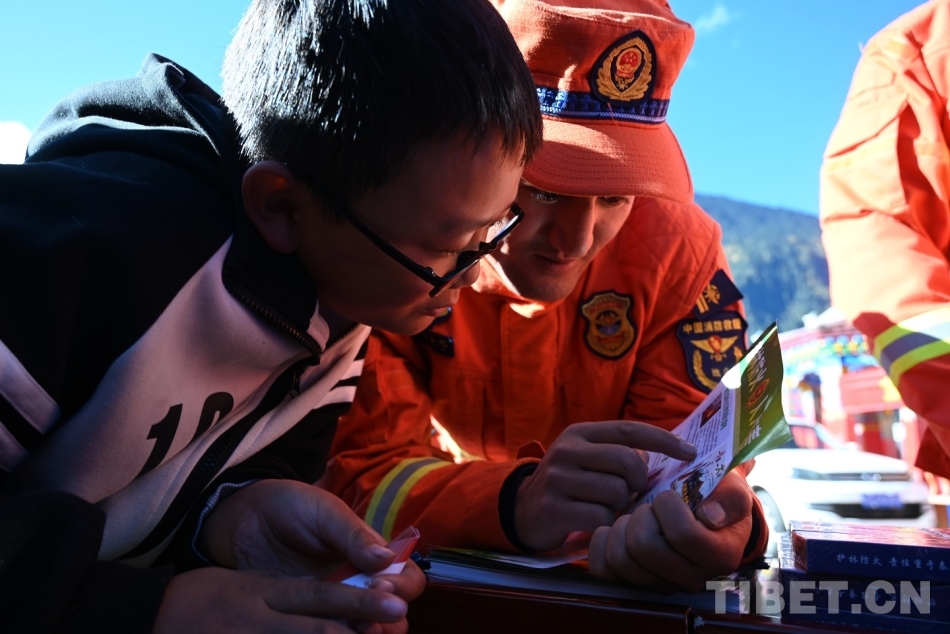 圖為指戰(zhàn)員給小朋友講解防火知識 攝影:仁青旺堆