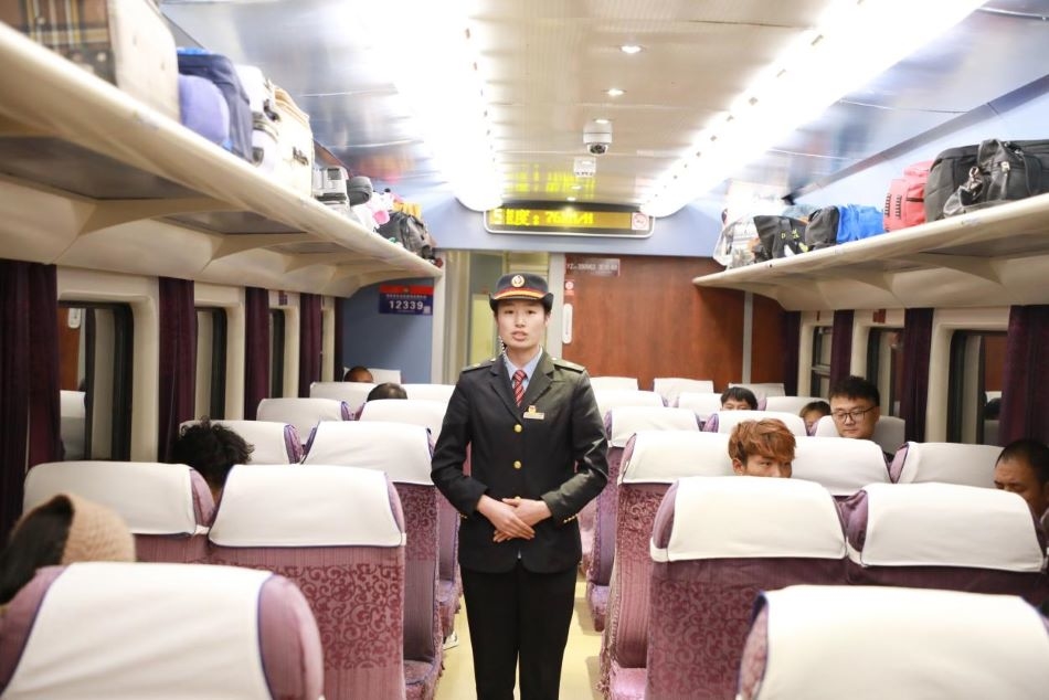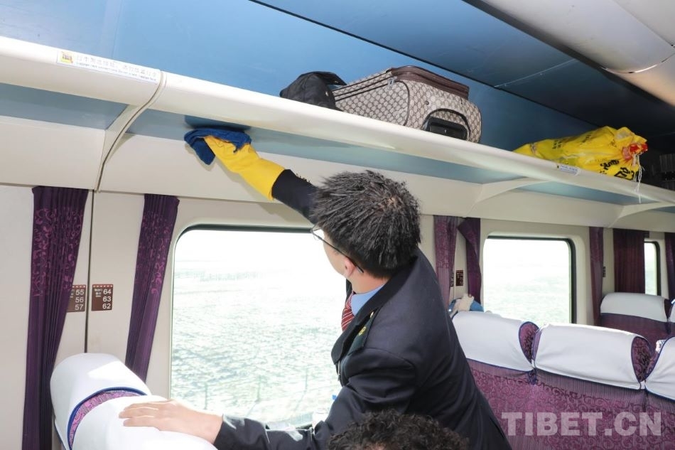 圖為乘務(wù)員在打掃車廂衛(wèi)生 攝影:陳衛(wèi)國(guó)