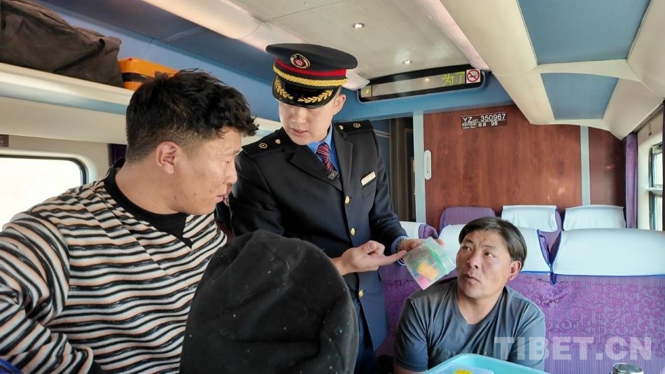 圖為乘務(wù)員用漢語(yǔ)、藏語(yǔ)、英語(yǔ)播報(bào)乘車注意事項(xiàng) 攝影:陳衛(wèi)國(guó)