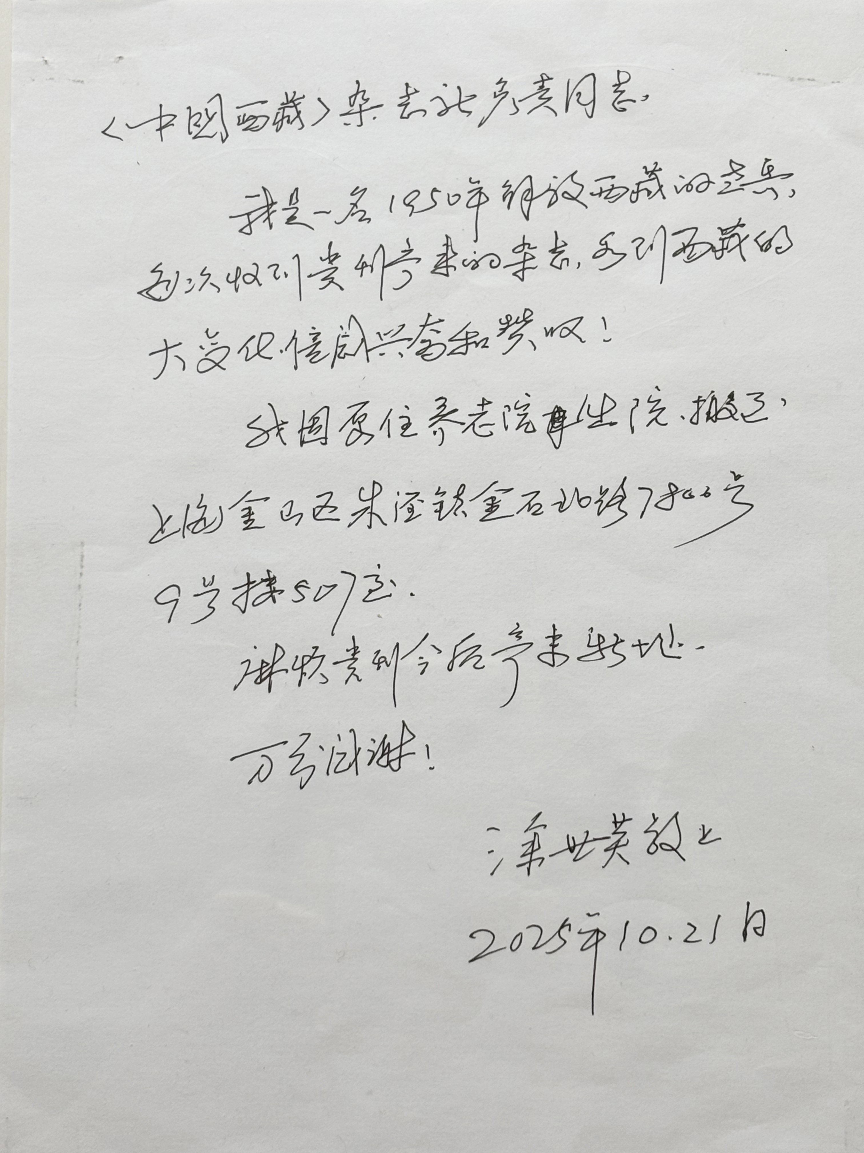 涂世英老先生,見字如面。您的來信,《中國(guó)西藏》雜志編輯部已完整收悉,心中滿是敬意與溫暖。我們深知,您是1950年便投身于解放西藏偉大事業(yè)的老兵,是雪域高原和平解放的親歷者、見證者,是用青春與熱血守護(hù)這片土地的先行者。歲月流轉(zhuǎn),您始終未曾放下對(duì)西藏的牽掛,每一次收到本刊,都為這片高原翻天覆地的變化感到由衷興奮和贊嘆。這份跨越時(shí)光的關(guān)注,讓我們每一位編輯都深受觸動(dòng)。