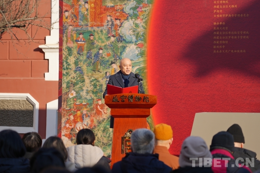 展覽開幕式現(xiàn)場,文化和旅游部黨組成員、故宮博物院院長王旭東,西藏自治區(qū)人民政府黨組成員、副主席徐志濤,故宮博物院原院長鄭欣淼,中國文物保護基金會理事長劉玉珠,中國佛教協(xié)會會長演覺,中國古跡遺址保護協(xié)會理事長宋新潮,國家民族事務(wù)委員會古籍整理研究室一級巡視員孫繼為,故宮博物院黨委書記、副院長都海江,文化和旅游部非物質(zhì)文化遺產(chǎn)司二級巡視員張玲,西藏自治區(qū)人民政府辦公廳二級巡視員旦巴央培,西藏自治區(qū)文化廳黨組成員、西藏自治區(qū)文物局黨組書記、副局長趙興邦,全國政協(xié)委員、薩迦寺寺管會常務(wù)副主任洛卓加措,香港賽馬會慈善事務(wù)部主管葉巧兒出席。文化和旅游部、國家文物局下屬文博單位,西藏自治區(qū)人民政府下屬相關(guān)單位,北京市人民政府下屬相關(guān)單位,本次展覽的獨家捐助方公益慈善研究院,相關(guān)協(xié)會、學(xué)會、基金會,各參展單位,特邀相關(guān)業(yè)務(wù)合作單位等也現(xiàn)場出席。