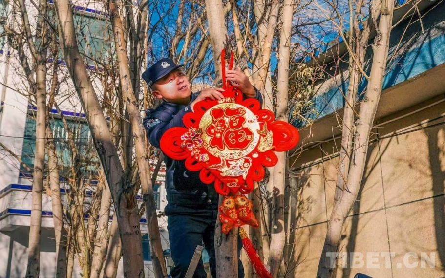 圖為紅“福”高懸迎新春。民警將寓意吉祥的紅色中國(guó)結(jié)懸掛在枝頭,金色的“福”字為冬日的警營(yíng)增添了濃濃的節(jié)日喜慶與溫暖。攝影:葉軼