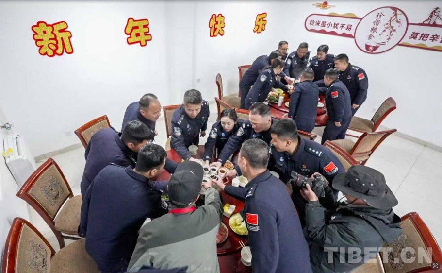 “干杯!”清脆的碰杯聲在餐廳里響起,暖意順著喉嚨流進(jìn)心里。“今年是在高原過(guò)的第一個(gè)年,雖然不能回家陪爸媽,但有大家在,感覺(jué)就像在家里一樣溫暖。”新警周康健邊吃邊發(fā)出感慨。