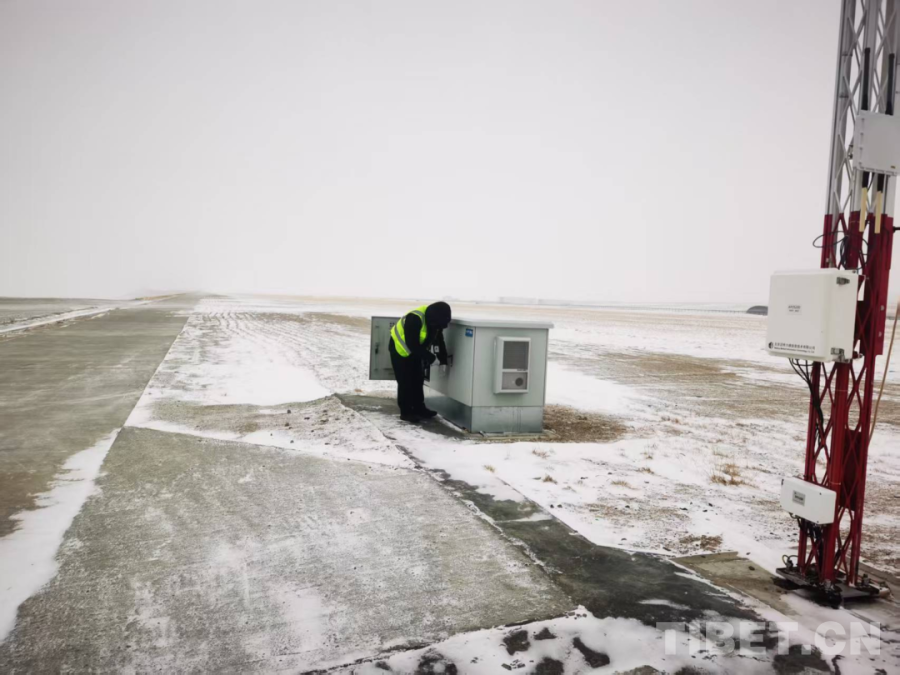 普蘭機(jī)場工作人員在風(fēng)雪中維護(hù)跑道設(shè)備