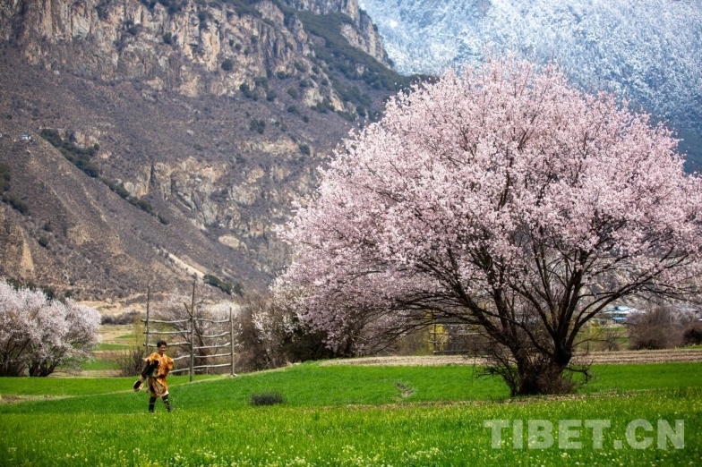 身著嘉黎特色服飾的姑娘,手捧桃枝,在雪山花海的映襯下,喜迎遠方來客。