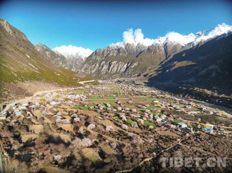 航拍視角下的尼屋春日,野桃林如粉霞般點綴在河谷村落,勾勒出“藏北江南”詩意畫卷。