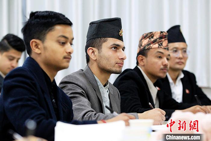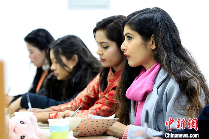 1月8日,西寧,設(shè)立在的青海大學(xué)藏醫(yī)學(xué)院的藏醫(yī)藥國(guó)際合作基地(青海)里,2019年“一帶一路”尼泊爾藏醫(yī)藥短期留學(xué)生班的21名“絲路使者”,聽(tīng)講神情專注。中新社記者 張?zhí)砀?攝