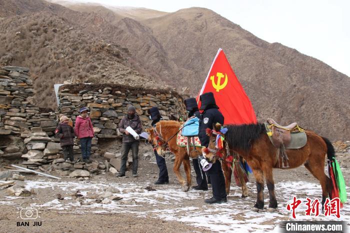 圖為馬背巡邏隊在轄區(qū)內(nèi)為牧民贈送口罩、發(fā)放藏漢雙語宣傳資料。 扎西蘭周 攝